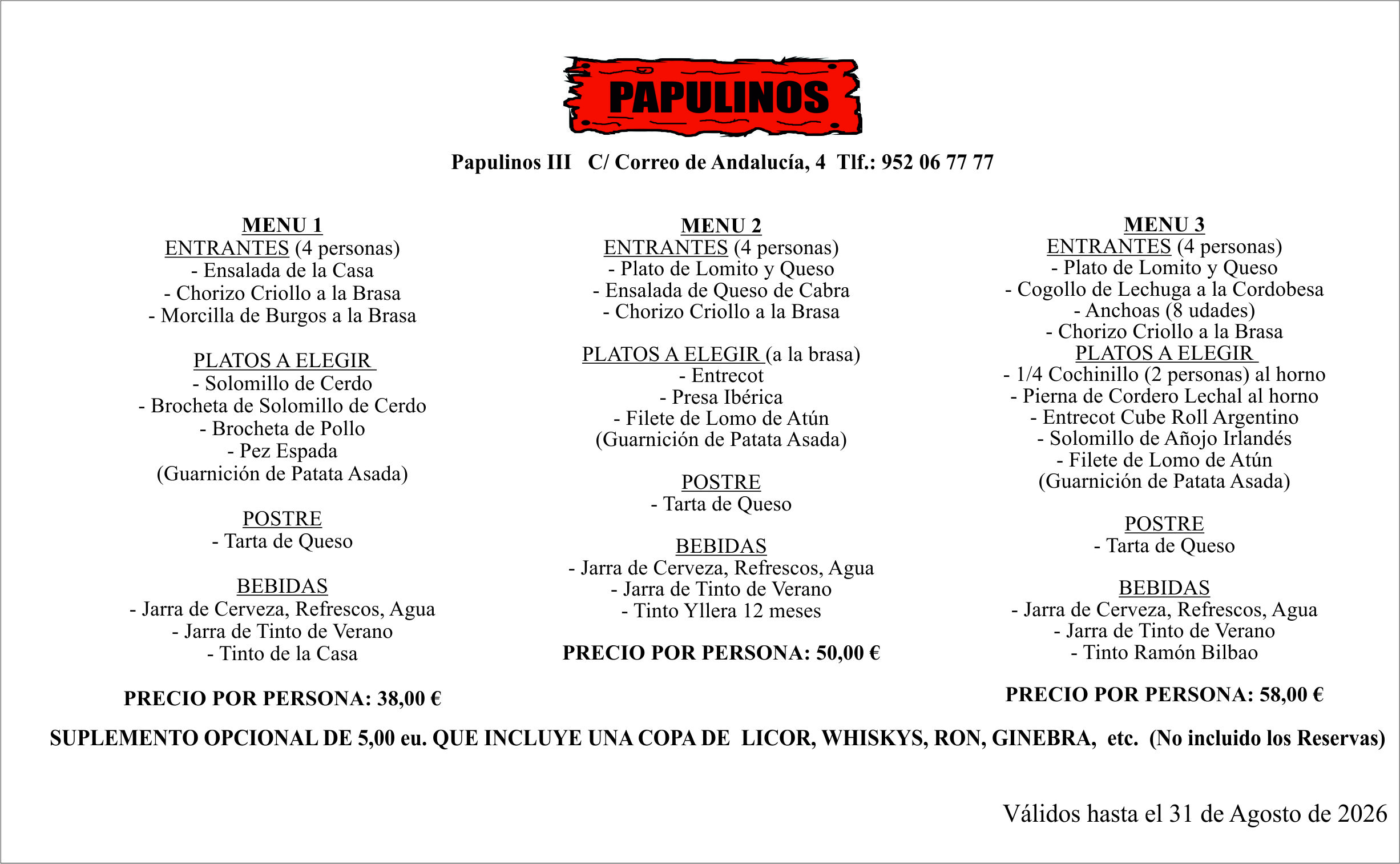 Situado en la zona oeste de Málaga, muy cerca de la playa de la Misericordia en el barrio más conocido como Santa Paula. Se ha intentado fusionar en este Restaurante lo mejor de cada Papulinos, aunque la idea principal es que se asemeje más a Papulinos I, recuperando un detalle que se perdió en Calle Malasaña a consecuencia de la normativas propias de esta actividad, una gran terraza al aire libre para degustar nuestras exquisitas carnes a la brasa bajo la frescura de la brisa propia de la cercanía del mar.